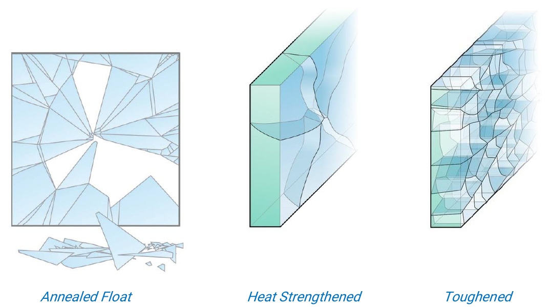 Additional strength may be required in glass due to sizes of units, wind loads and human impact factors. Regular annealed float glass can be heat treated for this by either Heat Strengthening (HS) or fully Toughening (TGH), which is also known as Tempering. If you line up the three types of glass types as per the images below, you may be able to break the Annealed Float glass by throwing a stone at it with minor strength and if it breaks, it will break as very sharp and dangerous shards of glass.