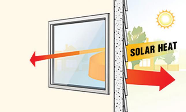 When looking at Type #1 Heat from the Sun, this heat travels in one direction, predominantly from the sun to the inside of our buildings via the glazing (the path of least resistance compared to a brick wall). When 100% of the heat reaches the window, instantly some of that heat is Reflected away, of the remaining energy some gets Absorbed by the glass and framing and the rest Transmits all the way through. R + A + T = 100% of the original heat.